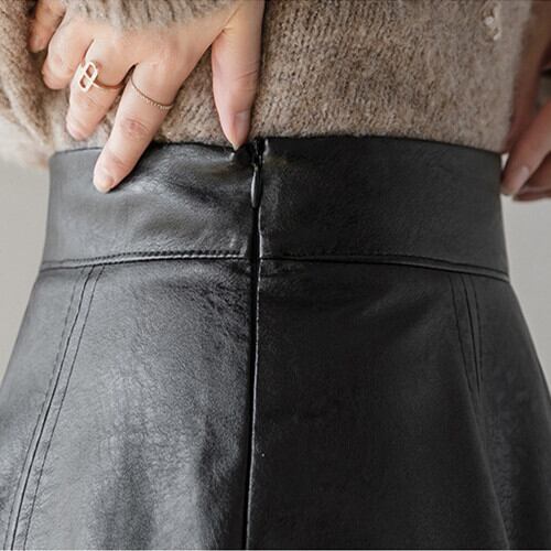 フェイクレザーで仕立てたこの黒いスカートは、ミニ丈ながらもふんわりとしたフレアーが魅力❕❕季節を問わず着用出来るため、秋冬にはタイツとの組み合わせで温かさを保ちつつ、春夏にはそのまま軽やかに着こなせる❕❕