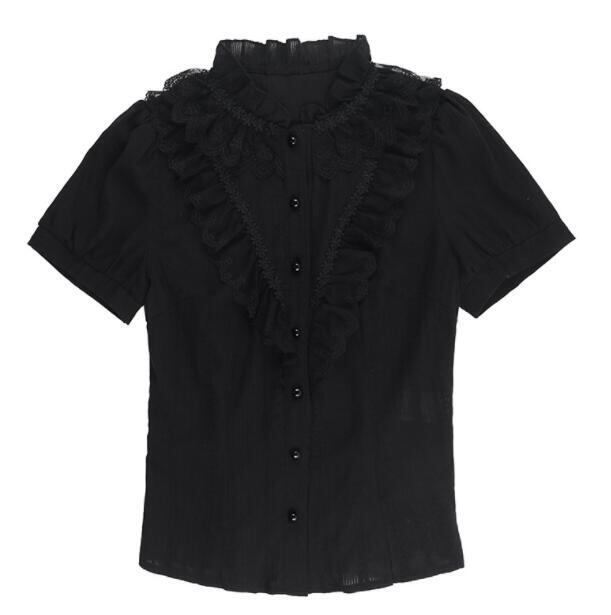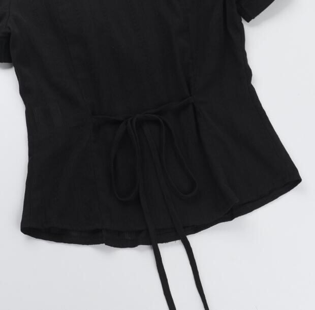 レースが施されたこの黒の半袖シャツは、フリフリなデザインが魅力的❕❕ 腰部分に施された紐で調整が可能なので、スタイルを細見えに演出します!カジュアルからフェミニンまで幅広いシーンで活躍すること間違いなしです❕