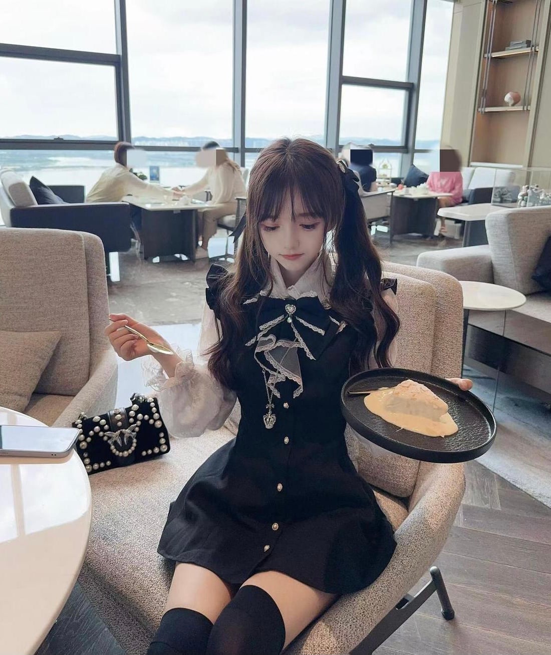 このワンピースは、量産型ファッションにぴったりなカジュアルでありながら可愛らしいアイテムです❕胸元のリボンと襟のレースが、キュートさを引き立て、あなたのスタイルを一層魅力的に演出します✨シックなブラックで、どんなシーンでも活躍間違いなしです❕