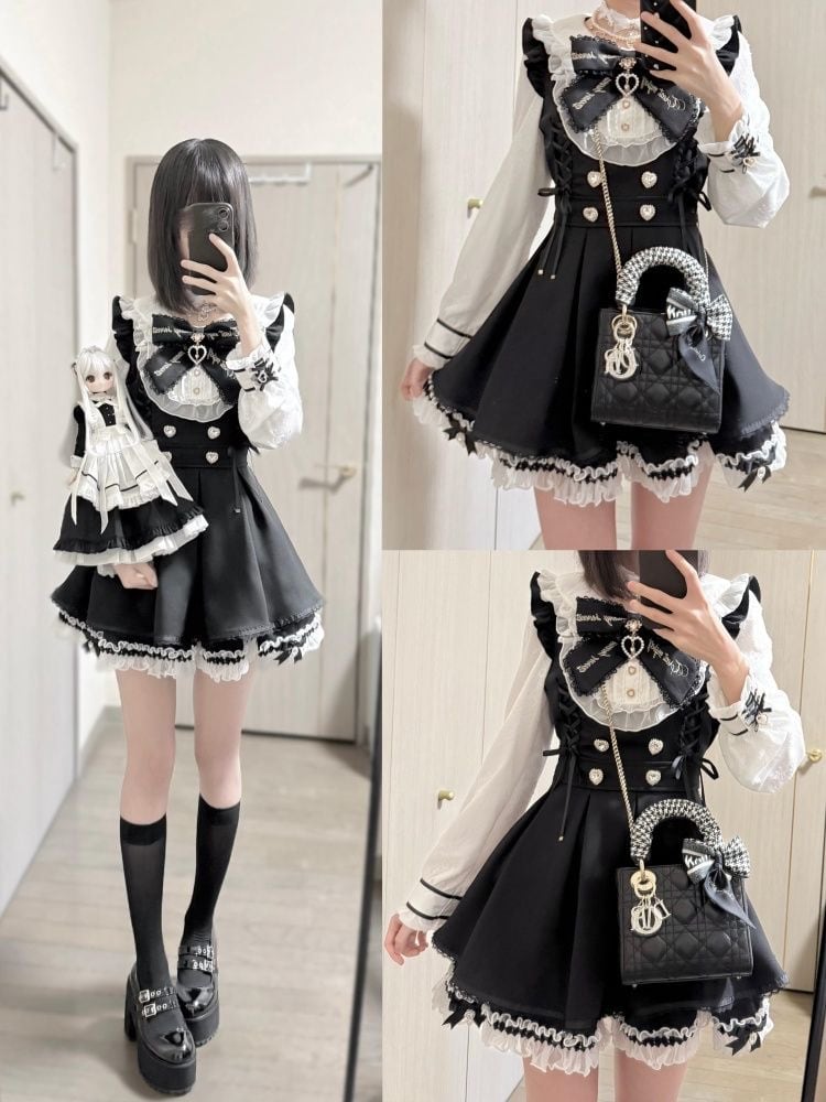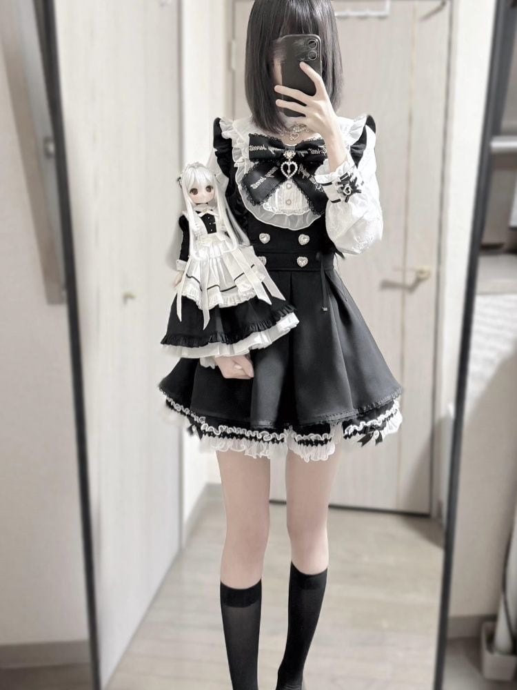 このロリータワンピースドレスは、可憐なリボンとフリルが施された魅力的なアイテムです❕モノクロの黒と白のセットアップは、シックさとかわいらしさを兼ね備え、あなたのファッションに華やかさをプラスします✨ハートのアクセントと4つのボタンが特徴で、さまざまなシーンで主役になれること間違いなしです❕