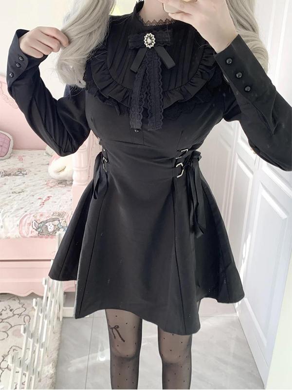 このブラック量産系♡レースワンピースは、ウエストリボンで細見えを叶えるロリータスタイルのアイテムです❕繊細なレースと長袖デザインが上品さを引き立て、甘く華やかな雰囲気を演出します✨特別なお出かけやライブなど、どんなシーンにもぴったりの一枚となっています♡