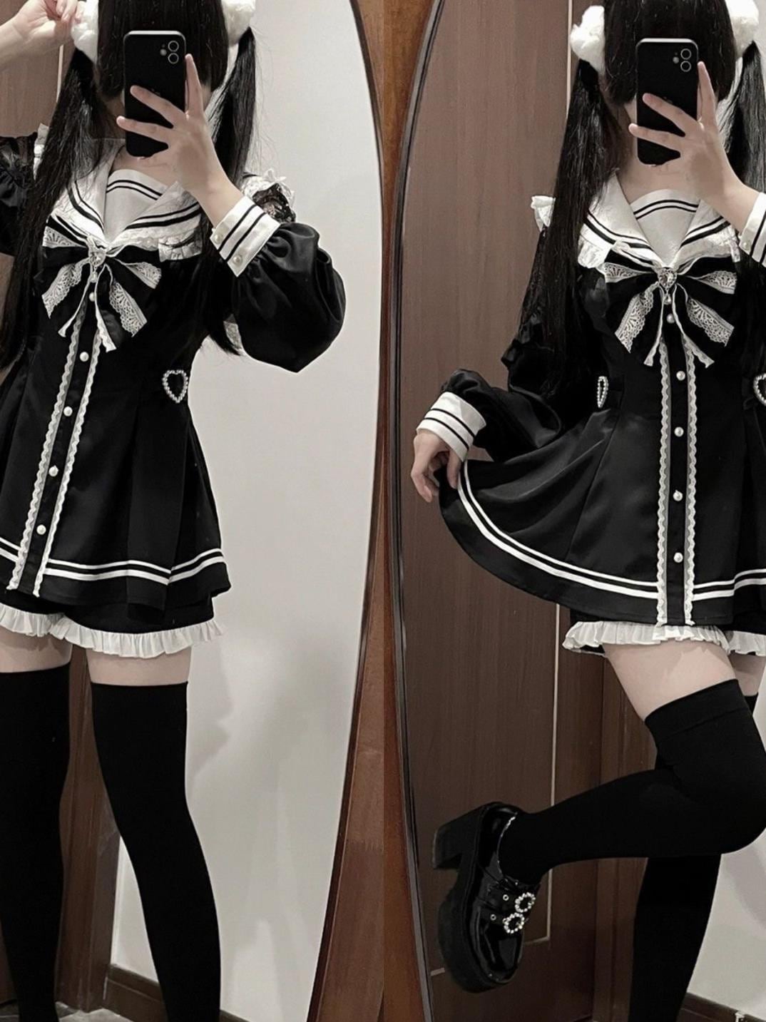 このリトルセーラー♡量産地雷系ツーピースセットアップは、秋冬の季節にふさわしいセーラーデザインが魅力的な一着です❕甘さと儚さを絶妙に融合させたスタイルは、ライブやデートにもぴったりの愛されコーディネートを実現できます✨ブラックカラーは、シックな印象を与えつつ、あなたの個性を引き立てること間違いなしです♡