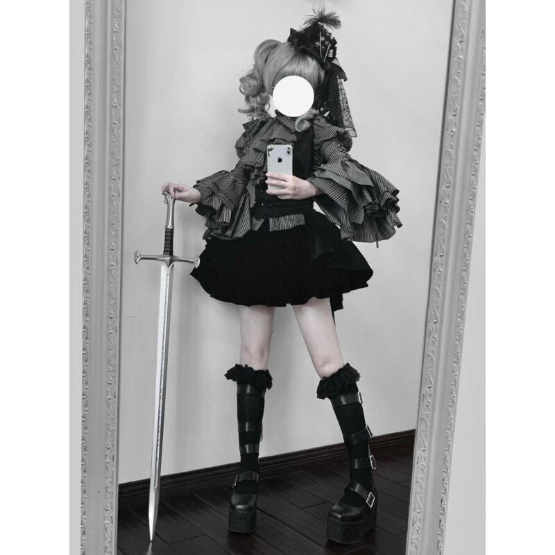 このセットアップは、ゴシック風のストライプが魅力的な姫系スタイルで、特別なシーンを演出します❕長袖シャツ、スリムベスト、ハイウエストスカートの3点セットが揃っており、モノクロカラーがシックでありながらも華やかさを引き立てます✨袖の広がりは、お姫様のような可愛らしい印象を与え、あなたのスタイルをより引き立てます❕