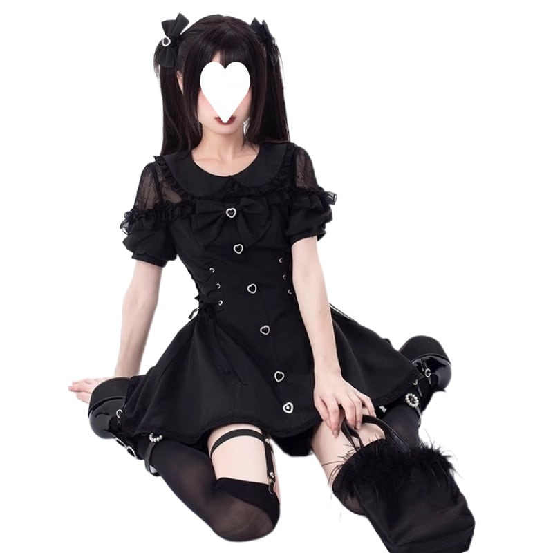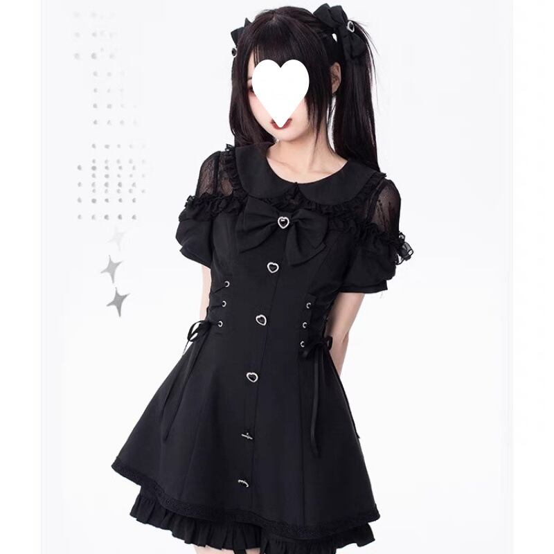 このゴシッククラシカルセットアップは、妖艶さと可愛らしさを併せ持つ魅力的な一品です❕肩と胸元には透け感のあるレース素材が使用されており、上品な肌見せが叶います✨ふんわりとしたパフスリーブがさらに可愛らしさを引き立て、リボン付きのウエスト部分は視覚的な細見え効果を演出します!胸元に施されたハート型チャームのリボンブローチが、全体のスタイルを華やかに彩ります❕