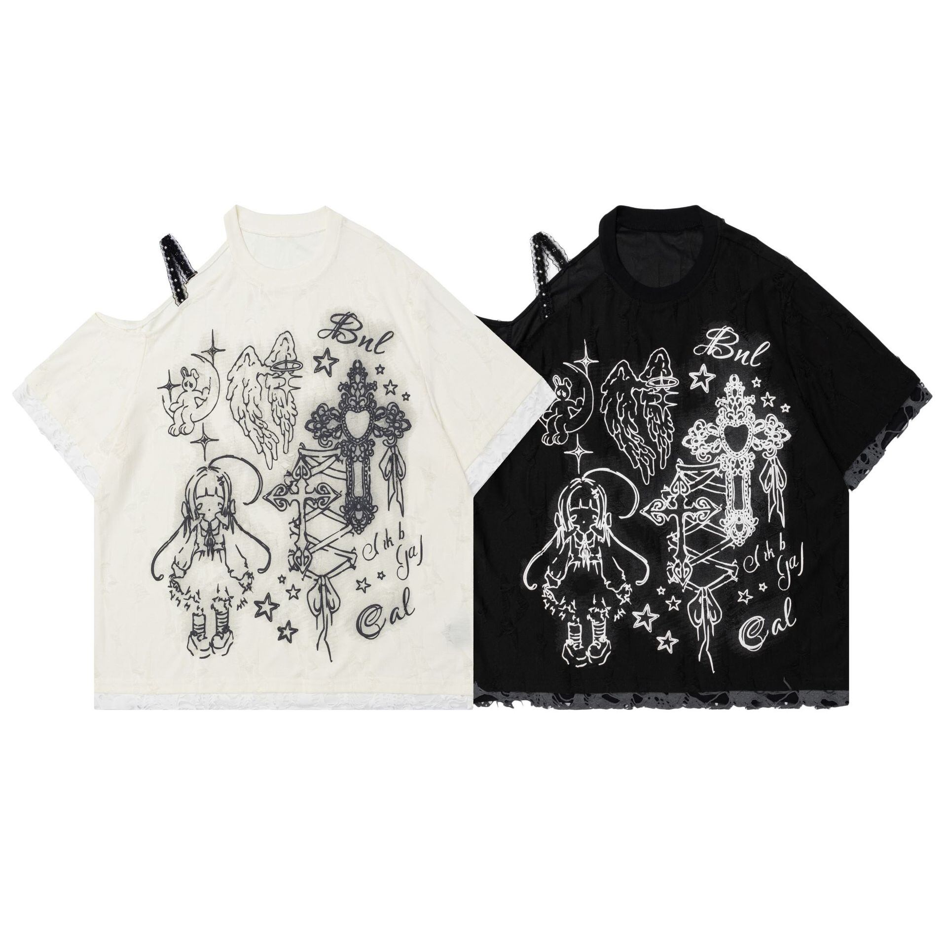 ゴシックドールプリントTシャツ 半袖 夏 肩出し