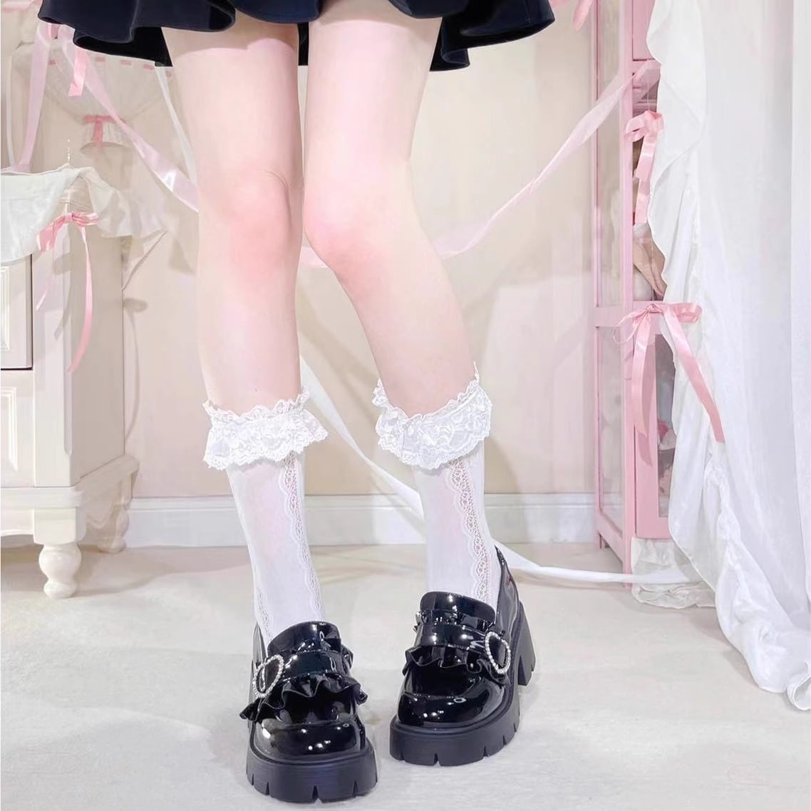 この厚底リボンシューズは、可愛らしさとスタイルアップを両立させたいあなたにぴったりの一足です❕ 丸いつま先と蝶結びリボンが甘いアクセントを加え、小柄女子にも似合うデザインになっています✨ 様々なコーディネートに合わせやすく、特別な日から日常使いまで幅広くお楽しみいただけます♡